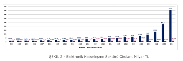 2003 yılında 14,98 milyar TL olan enflasyondan arındırılmış sektör gelirleri, 2020 yılında 15,27 milyar TL, 2024 yılında ise 15,17 milyar TL olarak ölçülüyor. Elektronik haberleşme sektörü, serbestleşmenin başladığı 2002 yılından itibaren 2020 yılına kadar büyük ölçüde durağan kalıyor, 2020’den sonra ise küçülme eğilimi gösteriyor. 2024 yılı itibarıyla sektör, 2003 yılındaki seviyesine geri dönüyor ve herhangi bir büyüme kaydetmiyor.
