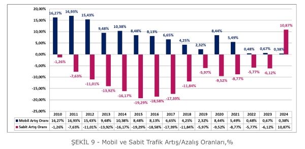 Rapora göre, sabit ses trafiği 2010 yılından itibaren ciddi düşüş eğilimi gösteriyor. 2022, 2023 ve 2024 yıllarına gelindiğinde mobil trafik artış oranlarında da yavaşlama olduğu dikkat çekiyor. Bununla birlikte, 2024 yılında 14 yıl içinde ilk defa sabit telefon trafiğinin bir önceki yıla göre artışa geçmiş olması dikkat çekiyor. Ancak, sektördeki rekabet eksikliği, yeni girişimcilerin fiyat ve kalite üzerindeki baskısının sınırlı olması, mevcut işletmecilerin Ar-Ge, yatırım ve tarife politikalarını olumsuz etkiliyor. Mobil trafik artış oranlarındaki yavaşlama ise, sektördeki büyüme dinamiklerinin yeniden gözden geçirilmesini gerektiriyor.