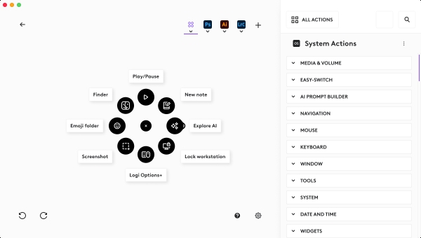 Aksiyon Halkası, Logi Options+ ile etkinleştirilen, 8 adet kısayol atanabilen dijital katmanıyla uygulamaya özel kısayollar ve özelleştirilebilir kontroller sunuyor. Kullanıcılar Photoshop’ta komut atayabiliyor ya da Excel’de işlemleri otomatikleştirebiliyor. Bu özellik profesyonellerin iş süreçlerinde daha hızlı ilerlemesini sağlıyor ve tekrar eden işlemleri büyük ölçüde azaltıyor.